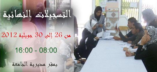 نعلم الطلبة الجدد و اللذين تم توجيههم إلى جامعة تيارت أن فترة التسجيلات النهائية تنطلق بتاريخ 26 جويلة و إلى غاية 30 جويلة 2012