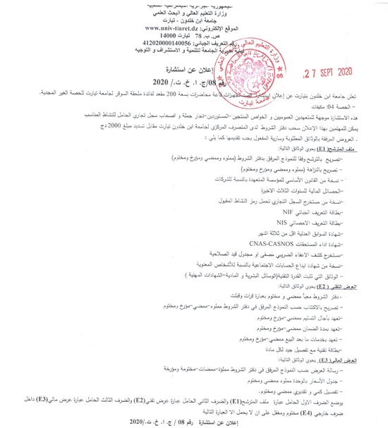 تعلن جامعة ابن خلدون بتيارت عن إعلان استشارة قصد تجهيزات قاعة محاضرات بسعة 200 مقعد لفائدة ملحقة السوقر لجامعة تيارت للحصة الغير المجدية.