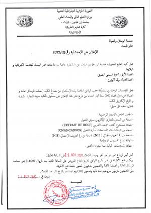 Avis de consultation N°03/2022 au profit de la faculté des sciences appliquées