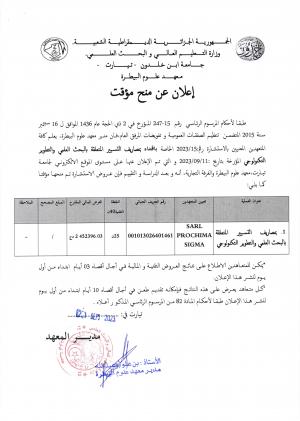 L’Institut des Sciences Vétérinaires de l’Université Ibn Khaldoun de Tiaret informe l’ensemble des soumissionnaires, ayant participé à la consultation n°15/2023, lancée le 11-09-2023 , aprés l'examen et l'évaluation des offres, le soumissionnaire provisoirement retenu est dans le fichier_joint.