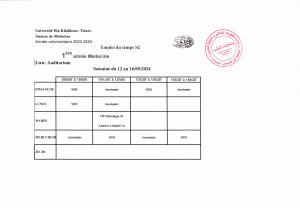 Publié le 09-05-2024Par SAHRAOUI DjamelStructure: Annexe de Médecine Veuillez trouver ci-joint l'emploi du temps à partir du dimanche 12/05/2024
