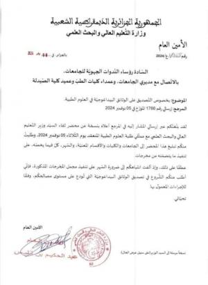 Publié le 06-11-2024Par SAHRAOUI DjamelStructure: Annexe de Médecine تجدون في الوثيقة المرفقة مراسلة السيد الأمين العام لوزارة التعليم والبحث العلمي الخاصة بالشروع في التصديق على الوثائق البيداغوجية في العلوم الطبية .