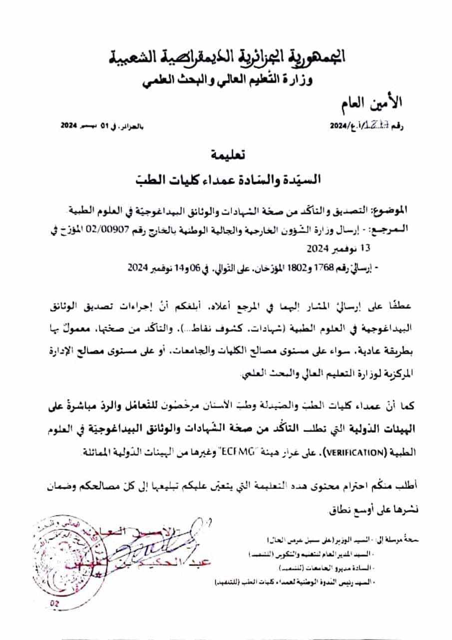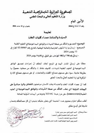 Publié le 02-12-2024Par SAHRAOUI DjamelStructure: Annexe de Médecine تجدون في المرفقات تعليمة وزارية بخصوص التصديق والتأكد من صحة الشهادات والوثائق البيداغوجية في العلوم الطبية