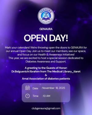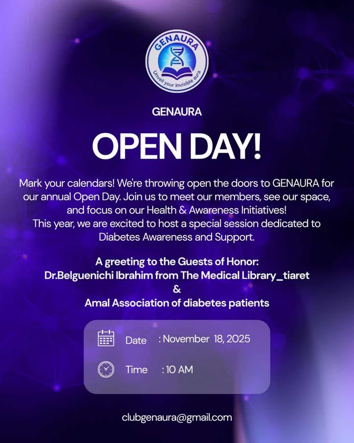 We would like to inform all students of the Medical Annex that the GENAURA Science Club will be organizing a diabetes awareness campaign tomorrow, Tuesday, November 18, 2025, with the participation of specialist physicians and the Al Amal Diabetes Association.